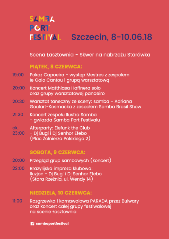 O godz. 19:00 na Łasztowni na skwerze na Nabrzeżu Starówka rozpocznie się także druga edycja Samba Port Festival. W programie: