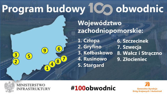 Cały program budowy stu obwodnic w Polsce ma kosztować 28 miliardów złotych. Pieniądze będą pochodzić z budżetu państwa i unijnych dofinansowań. Na Pomorzu Zachodnim projekt obejmie obwodnice miejscowości: Człopa, Gryfino, Kołbaskowo, Rusinowo, Stargard, Szczecinek, Szwecja, Wałcz i Złocieniec.