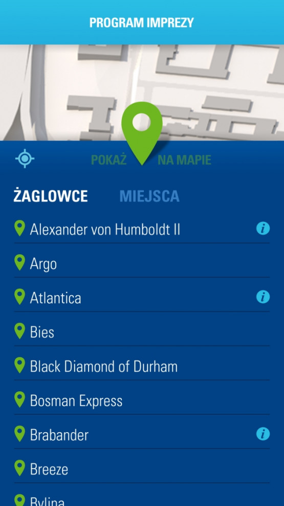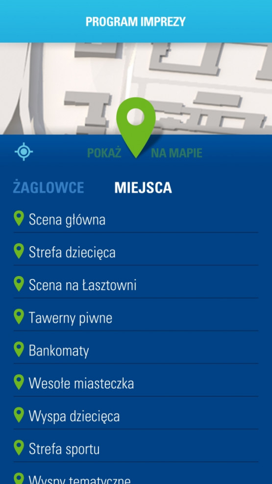 Aplikacja pozwala na wybór i filtrowanie miejsc dostępnych na terenie Zlotu. Ułatwia odnalezienie miejsca, w którym aktualnie odbywa się pożądana atrakcja. Aktualny program Finału Regat na wybrany dzień, dostępny jest w każdej chwili. Ekran z wyświetlonym programem można z łatwością zwinąć – przeciągając do góry, by przejść do innych opcji aplikacji.