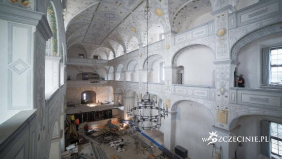 Modernizacja północnego skrzydła Zamku Książąt Pomorskich właśnie dobiega końca. W sali księcia Bogusława X, która do tej pory była pomalowana na biało, zakończono prace nad ogromną malaturą (obraz malowany farbami na ścianie lub drewnie), która pokryła ściany i sklepienia. To ponad 1000 metrów kwadratowych powierzchni. Ekipa 20 osób pracowała nad nią przez kilka miesięcy.