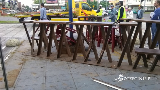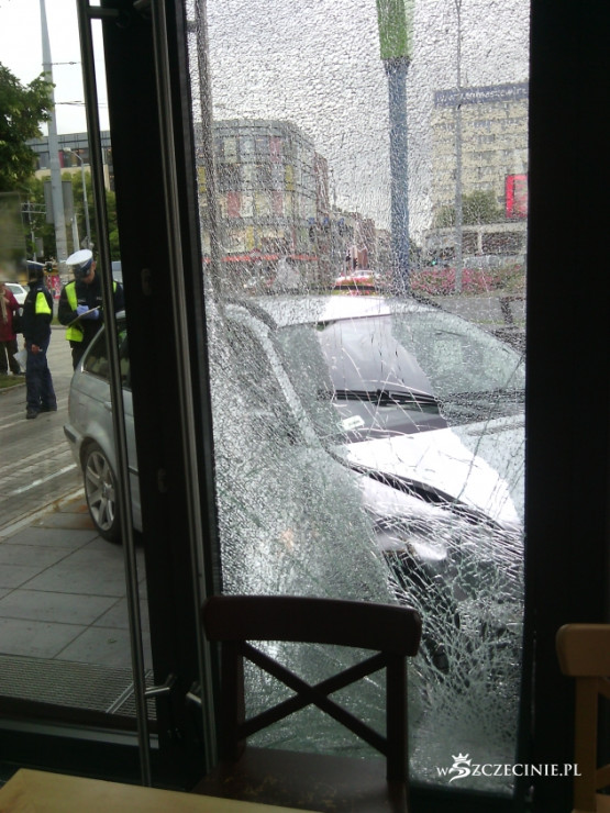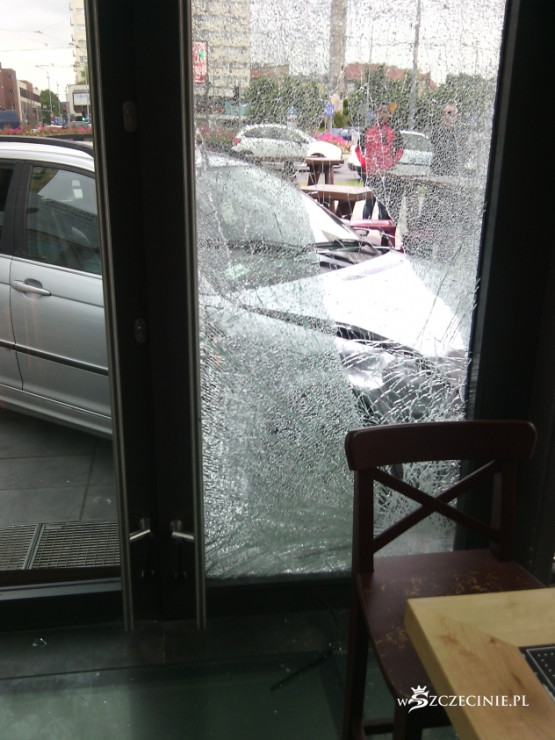 Srebrne BMW kierowcy dosłownie zmiotło bardzo ciężkie, połączone stalową konstrukcją stoliki przed kawiarnią, które przyjęły część siły uderzenia. Samochód wjechał w drzwi wejściowe, zniszczył szyby i wygiął nieco blachę, jednak konstrukcja nie została naruszona. Auto nie zostało mocno zniszczone.