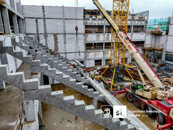 Obecnie na budowie nowego kompleksu sportowego trwa montaż trybun z prefabrykatów oraz instalacji elektrycznych.