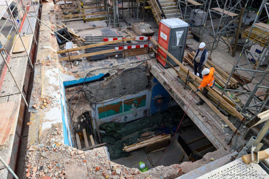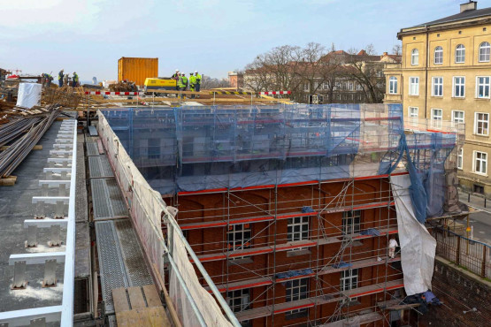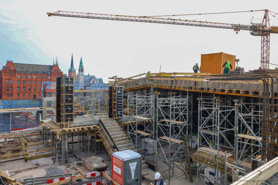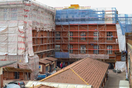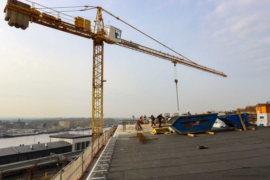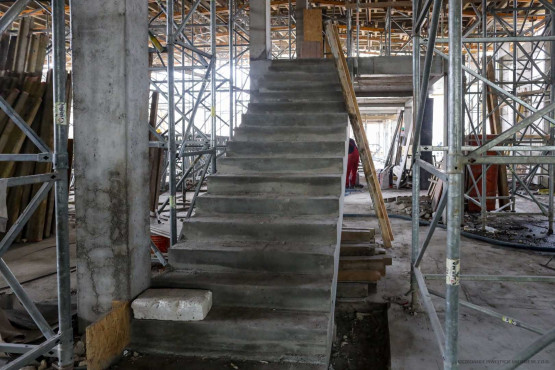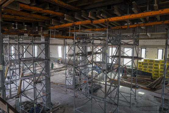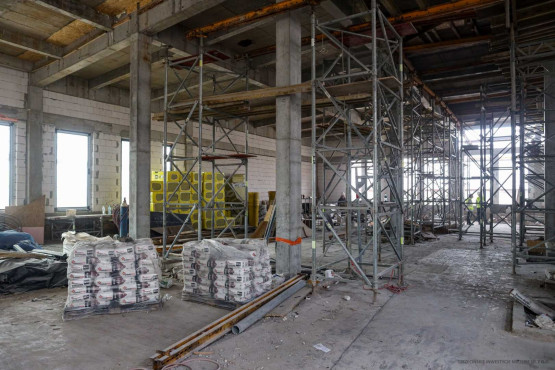 Prace prowadzone są również wewnątrz budynku. Jedna z trzech głównych klatek schodowych została już dostosowana do wymagań przeciwpożarowych i ewakuacyjnych. Teraz trwają prace przy przebudowie konstrukcji dwóch kolejnych. Na nowej kondygnacji fasada wykonywana jest z płyt włókno-cementowych.
