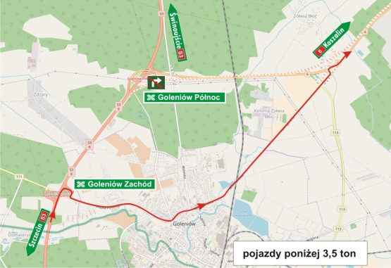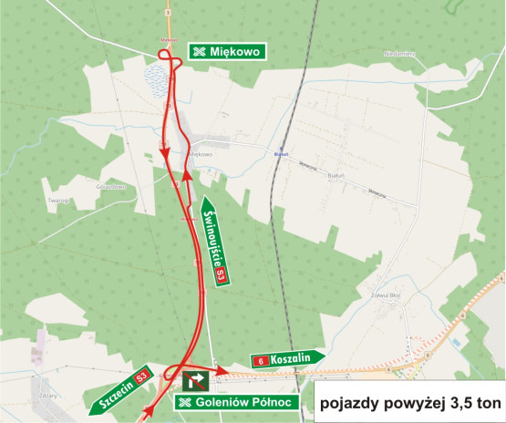 Do piątku, 13 października, na węźle Goleniów Północ zamknięta będzie jezdnia wschodnia, ruch odbywa się w dwóch kierunkach po jezdni zachodniej. Zamknięta została również łącznica relacji Szczecin – Gdańsk. W związku z tym wprowadzono objazdy przez Miękowo dla pojazdów powyżej 3,5 tony i zalecany objazd przez Goleniów dla pojazdów poniżej 3,5 tony.