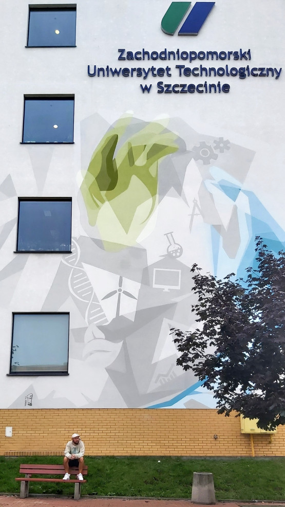 Pomiędzy dłońmi znajdują się atrybuty nawiązujące do dyscyplin naukowych, które reprezentuje Zachodniopomorski Uniwersytet Technologiczny w Szczecinie. Mural można oglądać jadąc samochodem lub tramwajem przez aleję Piastów w kierunku Pomorzan.
