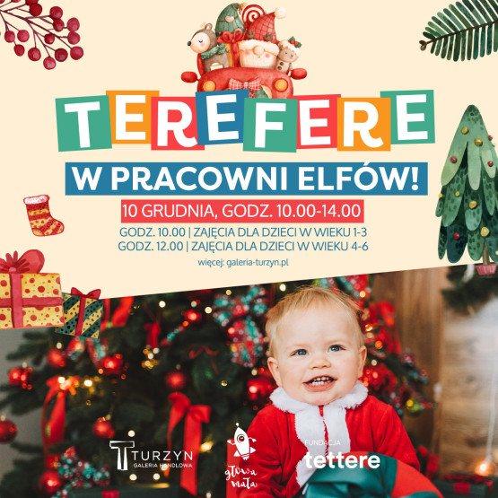 Już w najbliższą sobotę 10 grudnia spotykamy się najmłodszymi miłośnikami Świąt! Dając ponieść się grudniowemu szaleństwu, zapraszamy na kolejne spotkanie z cyklu TEREFERE. Tym razem, wspólnie z Fundacją Tettere oraz kolektywem Głowa Mała, wejdziemy do niezwykłego świata dzielnych pomocników Mikołaja. Sala taneczna Strefy ROOFA na 1. piętrze Galerii Handlowej Turzyn (wejście obok sklepu Reserved) zamieni się w Pracownię Elfów! A my zaprosimy dzieci do wspólnych zabaw okołoświątecznych, podczas których zaproponujemy ćwiczenia rytmiczne i ruchowe, a także zajęcia plastyczne. Wspólnie pobawimy się w Elfy, szykujące ozdoby świąteczne!