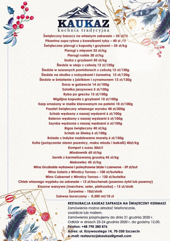 W Restauracji Kaukaz świąteczne potrawy można też zamówić z dowozem do domu. Pod wskazane adresy będą one rozwożone 23 i 24 grudnia. Zamówienia można składać telefonicznie lub mailowo: 790 380 876, kontakt@restauracjakaukaz.pl.