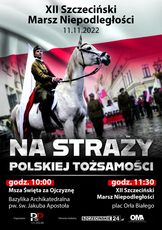 11 listopada ulicami naszego miasta już po raz 12. przejdzie Szczeciński Marsz Niepodległości. Wydarzenie rozpocznie się o godz. 11:30 na pl. Orła Białego od wspólnego odśpiewania hymnu Polski, po czym uczestnicy ruszą w kierunku placu Szarych Szeregów. Trasa marszu przebiegać będzie ulicami: pl. Orła Białego (rozpoczęcie) – Grodzka – Sołtysia – Wyszyńskiego – al. Niepodległości – pl. Żołnierza Polskiego – al. Wyzwolenia – pl. Rodła – Piłsudskiego – pl. Grunwaldzki – pl. Odrodzenia – pl. Szarych Szeregów (zakończenie). W tym roku wydarzenie organizowane jest pod hasłem „Na straży polskiej tożsamości”. Jego organizatorzy, Porozumienie Środowisk Patriotycznych w Szczecinie, zapewniają, że wydarzenie będzie mieć spokojny przebieg. Szczegóły: https://www.facebook.com/events/2158904454297910/