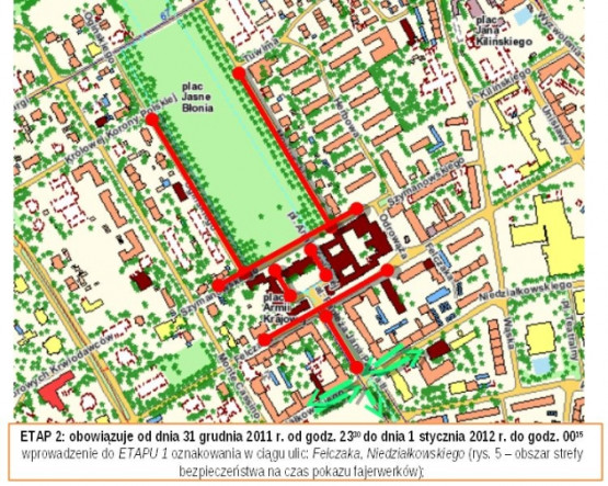 Kolejne zmiany wprowadzone zostaną 31 grudnia 2011 r. o godz. 23.30 i obowiązywać będą do godz. 0.15 w dniu 1 stycznia 2012 r. Ze względów bezpieczeństwa na czas przygotowania i trwania pokazu fajerwerków wyłączone z ruchu zostaną dodatkowo: