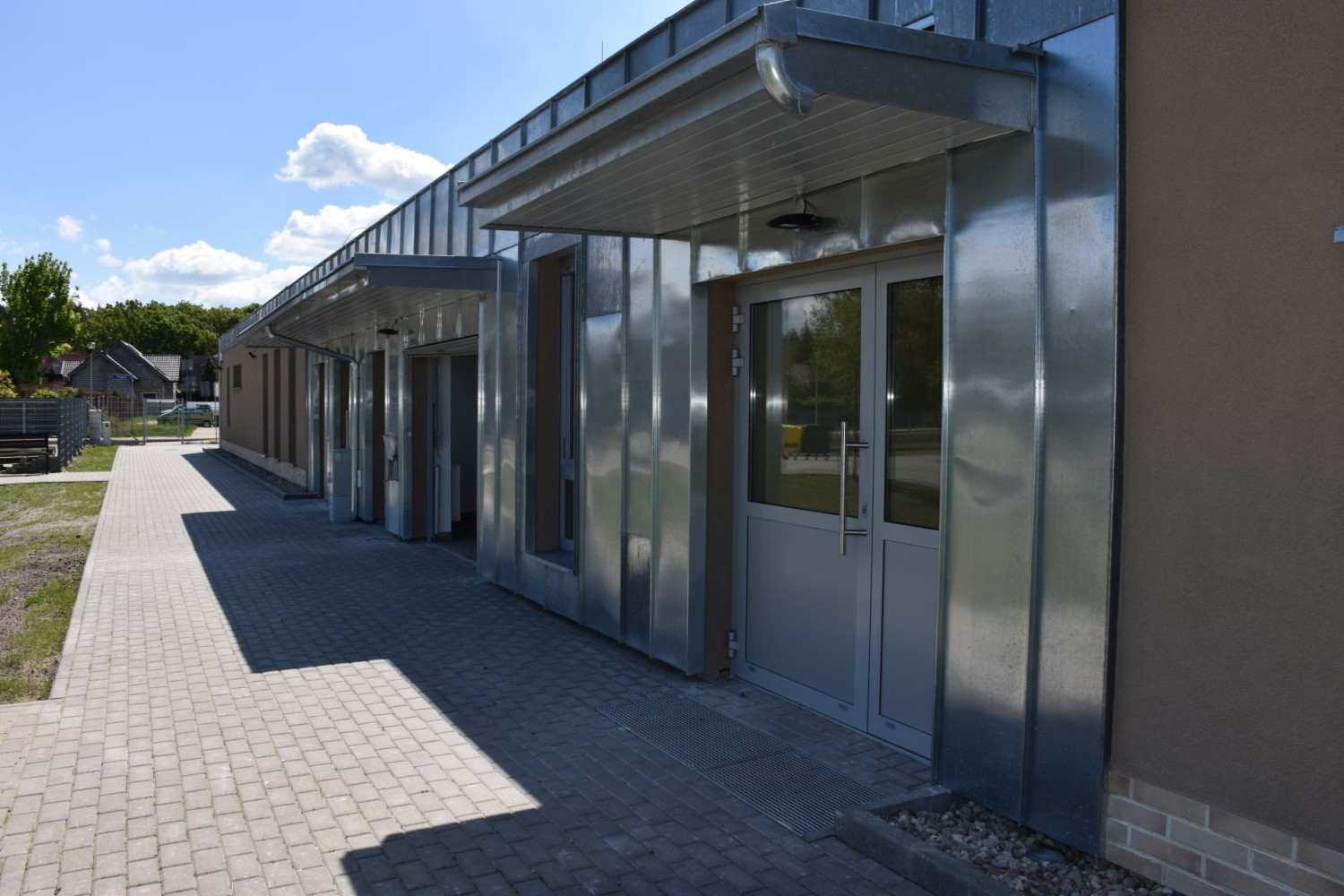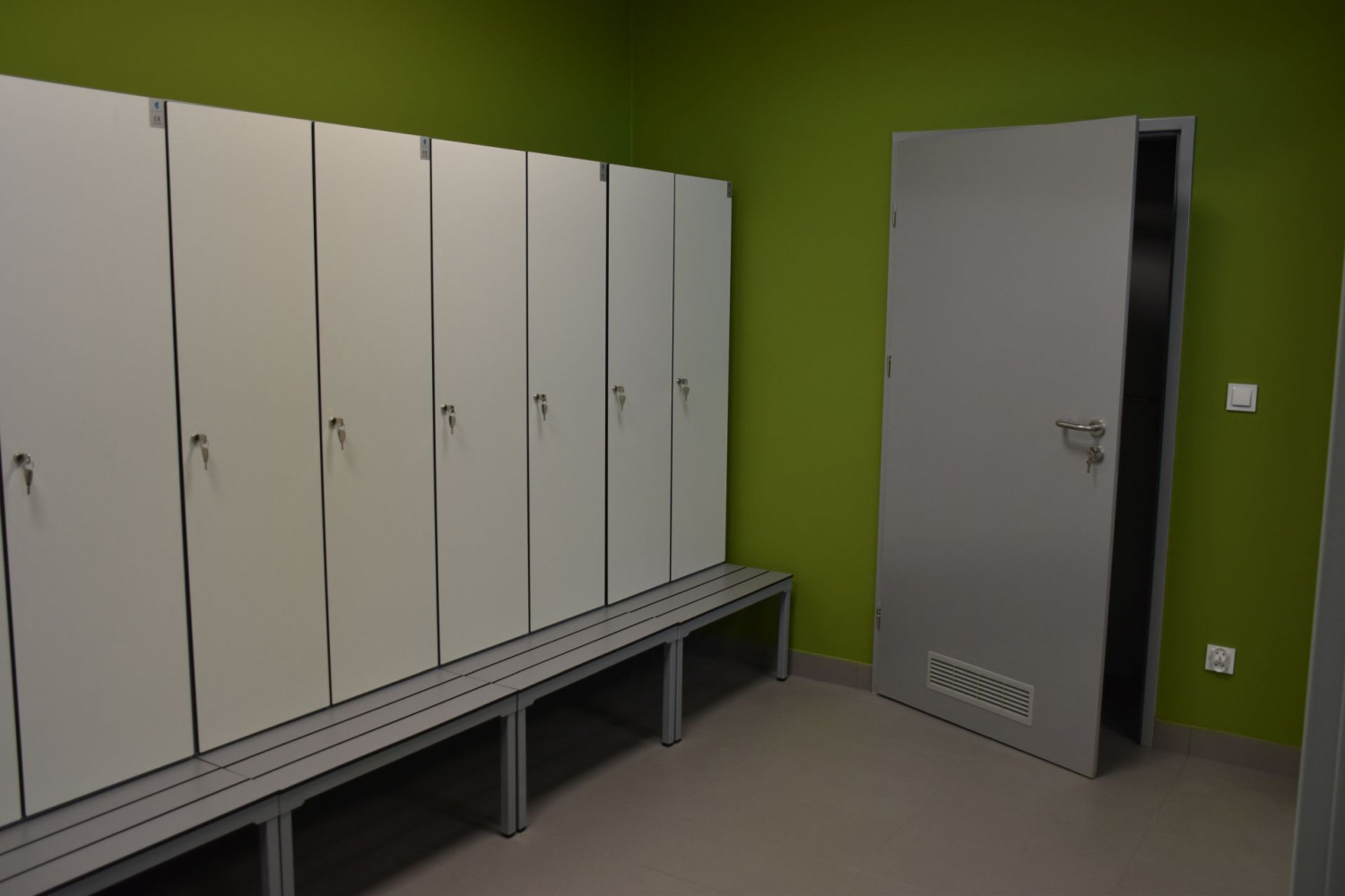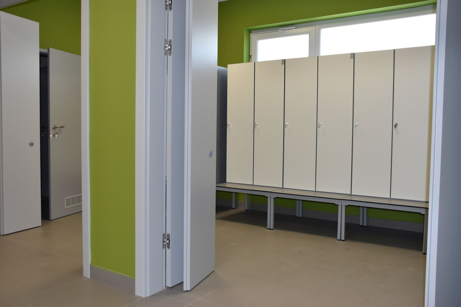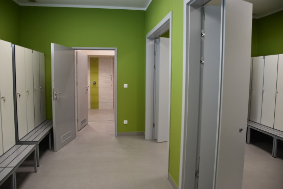 Znajdują się w nim 4 szatnie, każda dla 12 piłkarzy, z własnym węzłem sanitarnym, z możliwością połączenia za pomocą przesuwnych drzwi w dwie szatnie. Obok szatni dla piłkarzy powstała szatnia dla sędziów, z własnym węzłem sanitarnym, a także pomieszczenie służbowe dla osoby dozorującej obiekt, wc dla piłkarzy, biuro i kotłownia, w której znajdą się zasobniki i urządzenia techniczne. W budynku znajduje się także pomieszczenie gospodarcze z bramą wjazdową – jako miejsce garażowe dla sprzętu do utrzymania murawy i terenu. Dla kibiców dostępna będzie publiczna toaleta dostosowana do potrzeb osób niepełnosprawnych.