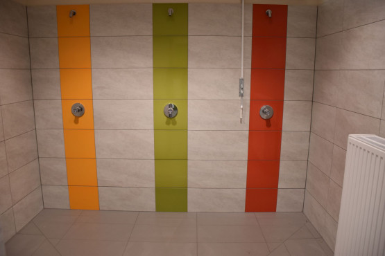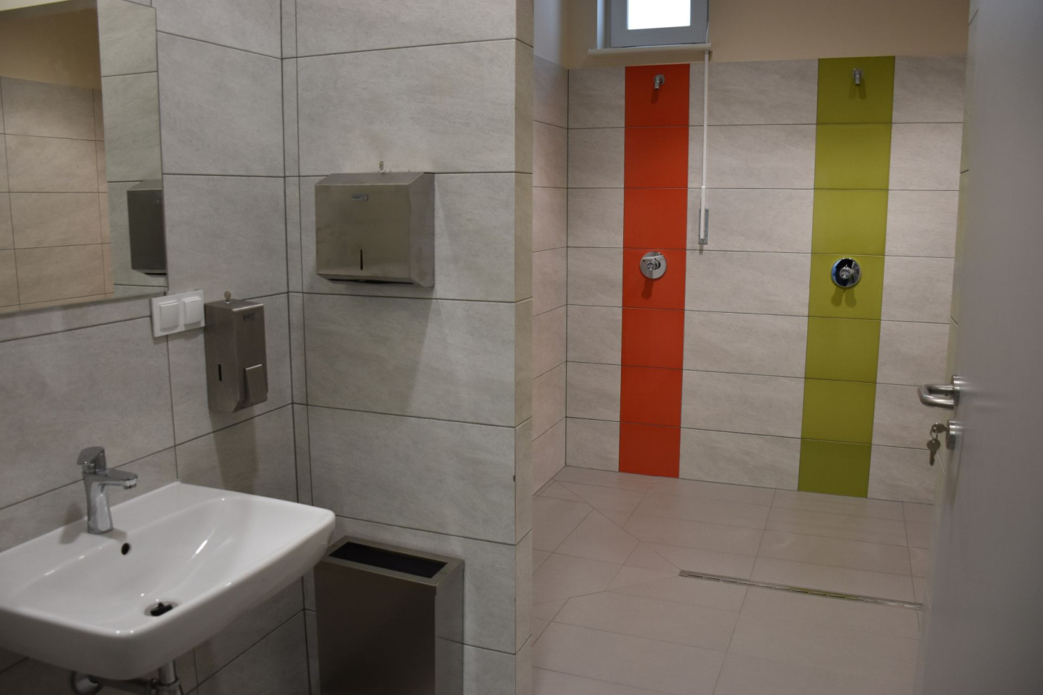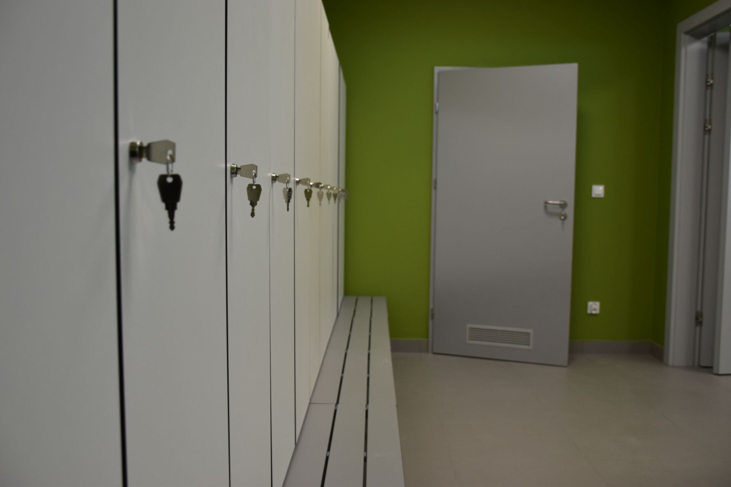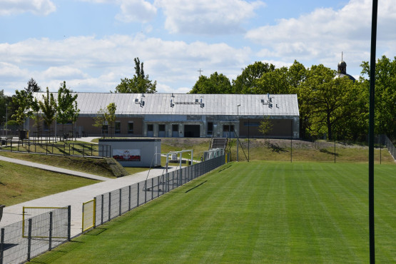 Znajdują się w nim 4 szatnie, każda dla 12 piłkarzy, z własnym węzłem sanitarnym, z możliwością połączenia za pomocą przesuwnych drzwi w dwie szatnie. Obok szatni dla piłkarzy powstała szatnia dla sędziów, z własnym węzłem sanitarnym, a także pomieszczenie służbowe dla osoby dozorującej obiekt, wc dla piłkarzy, biuro i kotłownia, w której znajdą się zasobniki i urządzenia techniczne. W budynku znajduje się także pomieszczenie gospodarcze z bramą wjazdową – jako miejsce garażowe dla sprzętu do utrzymania murawy i terenu. Dla kibiców dostępna będzie publiczna toaleta dostosowana do potrzeb osób niepełnosprawnych.