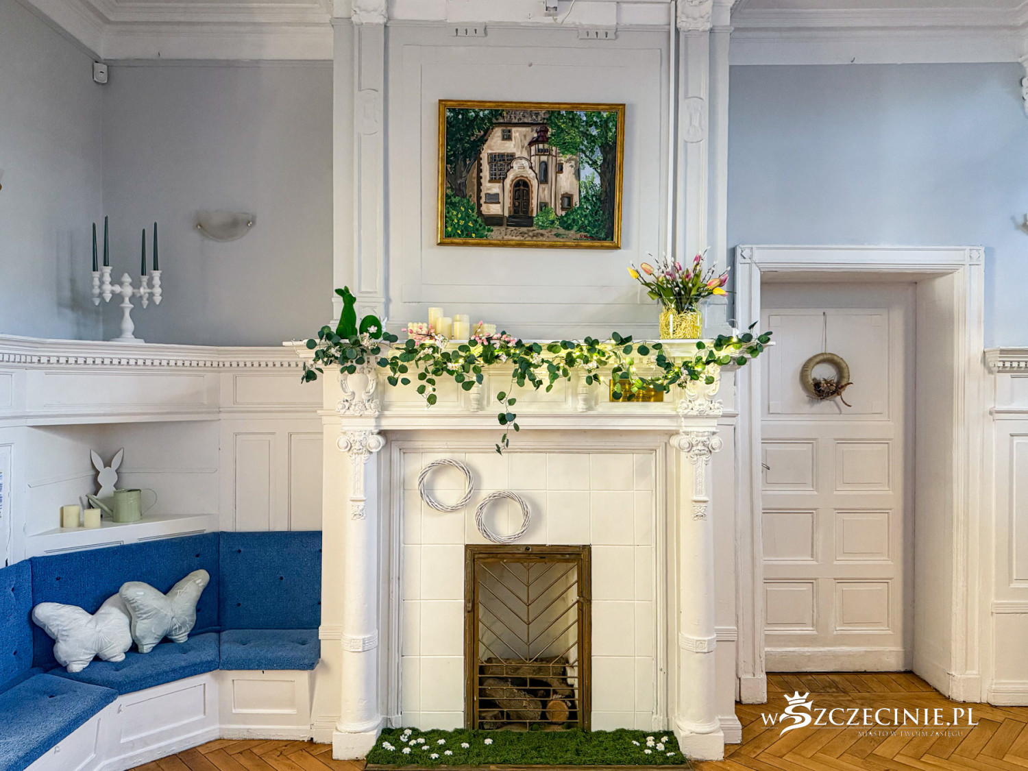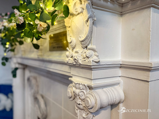 Duże wrażenie robi hol wyłożony dębową boazerią z ozdobnym kominkiem i dekoracyjną balustradą przy drewnianych schodach.