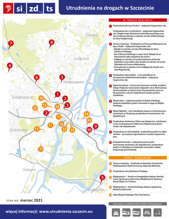 Magistrat uruchomił nawet specjalną stronę - https://www.szczecin.eu/pl/utrudnienia-drogowe - na której podawane mają być dokładne informacje dotyczące wszystkich aktualnych utrudnień na drogach. Z jakimi inwestycjami będą związane?