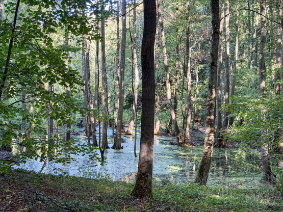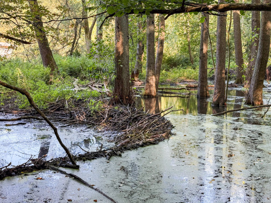 Bobry się stąd wyniosły, ale wystarczy wejść nieco głębiej w las, by znaleźć zbudowane przez nich z wielkim rozmachem żeremia i tamy, tworzące dwupoziomowe rozlewiska.