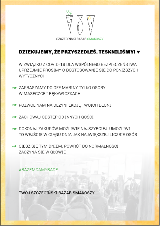 W czasie pandemii rząd nie zamknął bazarów. Mogą działać, podobnie chociażby jak sklepy spożywcze. Co więcej, wszyscy zachęcają w tym trudnym czasie właśnie do zakupów u krajowych producentów. Powrót Szczecińskiego Bazaru Smakoszy do stacjonarnej działalności będzie dużym wsparciem dla lokalnych wytwórców, którzy w przeważającej części zmagają się obecnie z problemami. Oczywiście sprzedaż na Bazarze będzie odbywała się z zachowaniem wszelkich reguł bezpieczeństwa wymaganych przez Główny Inspektorat Sanitarny.