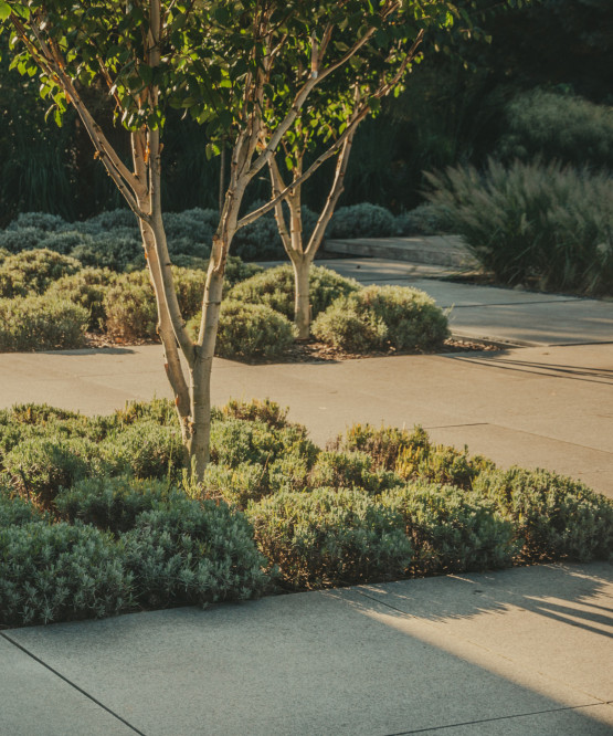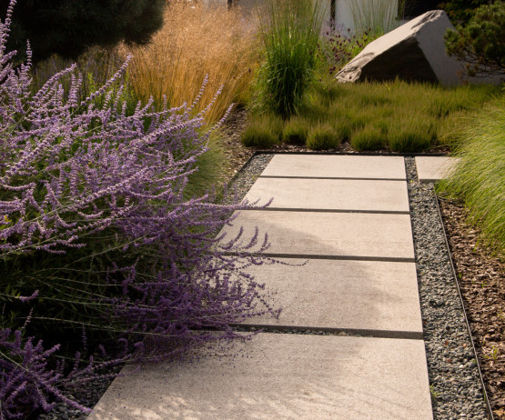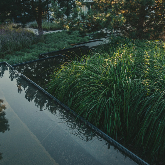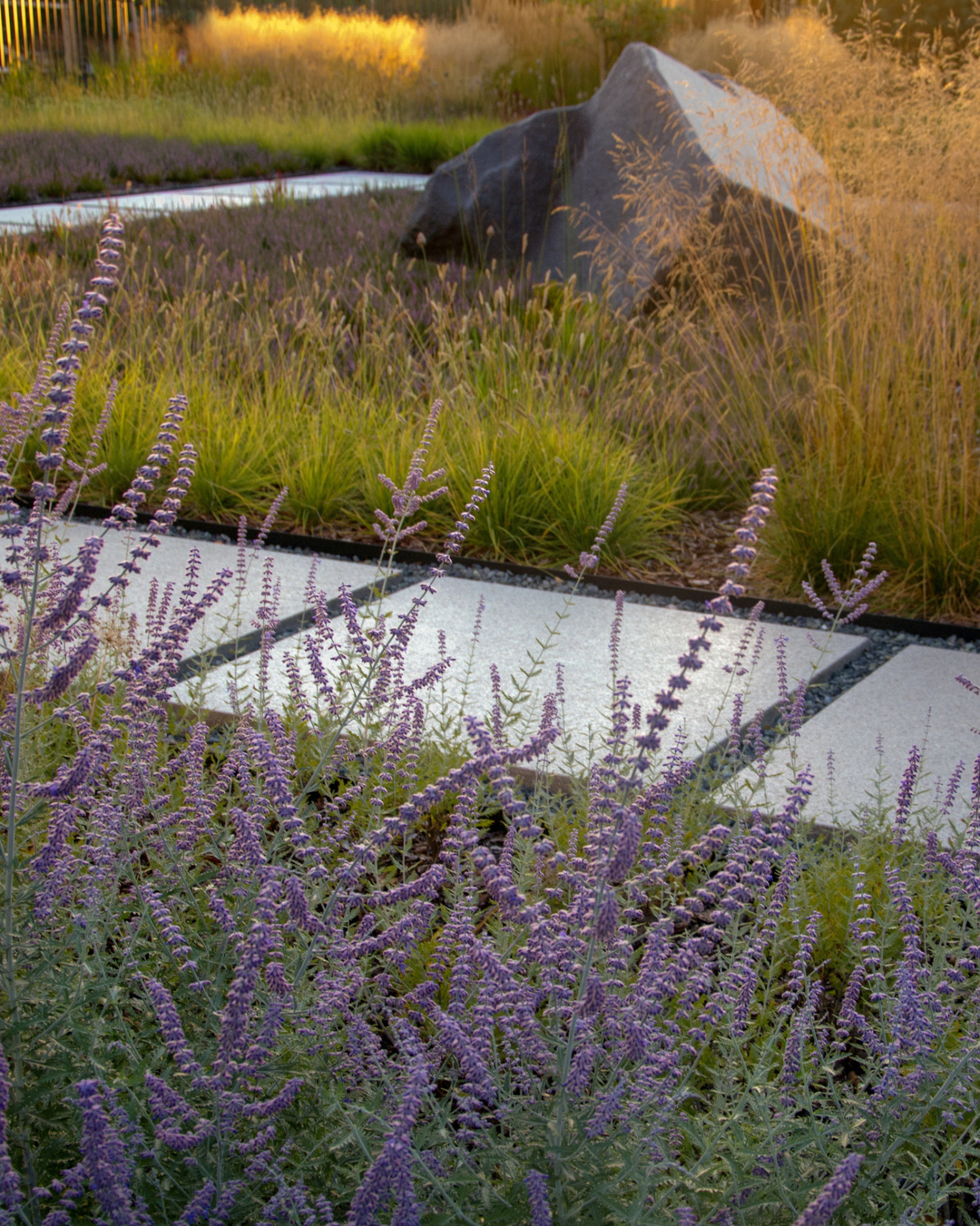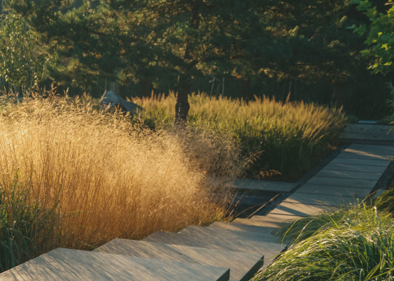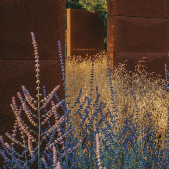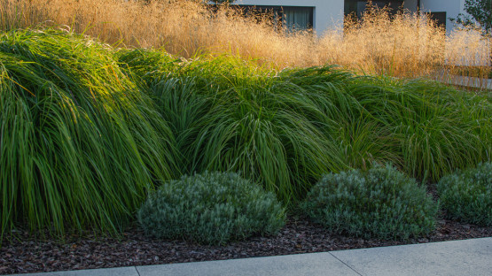 Wiktor Kłyk wybrał rośliny dopasowane do lokalnych, trudnych warunków. To m.in. śmiałek darniowy, który w połowie lata wprowadza złote akcenty. Przeplata się z grupami seslerii jesiennej, rozplenicy japońskiej, wrzosu pospolitego oraz obcej, ale wyjątkowo wytrzymałej lawendy pośredniej.