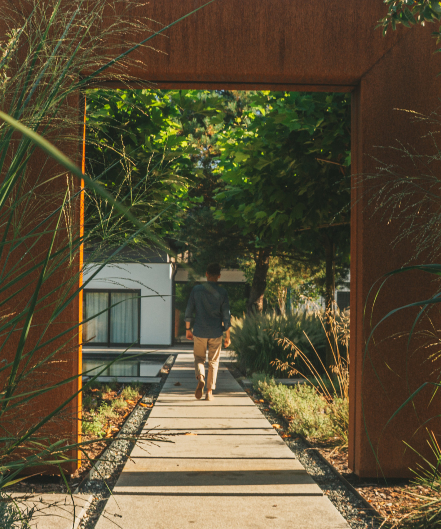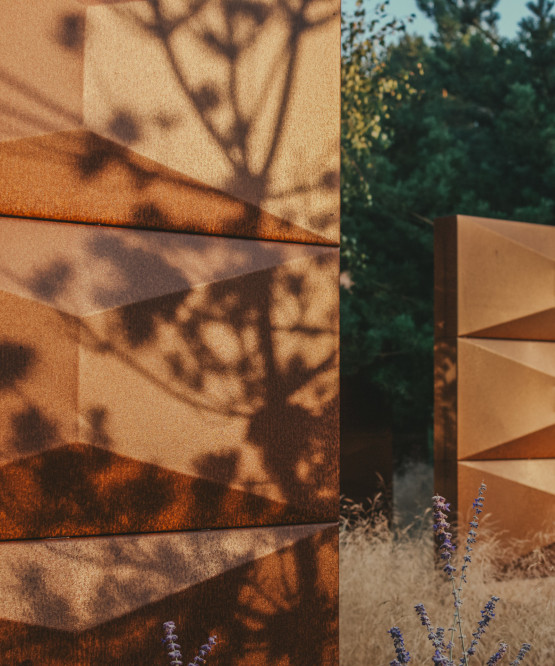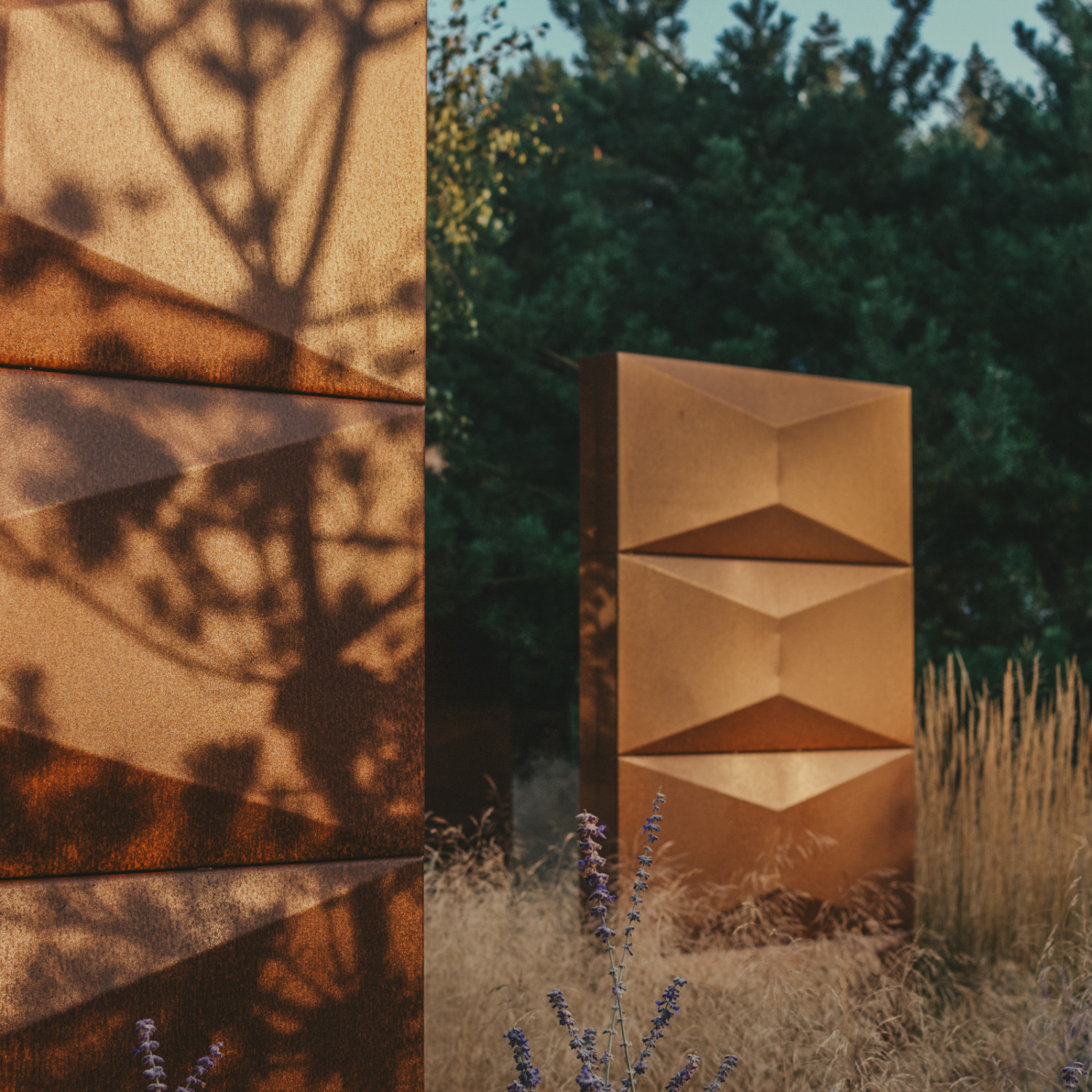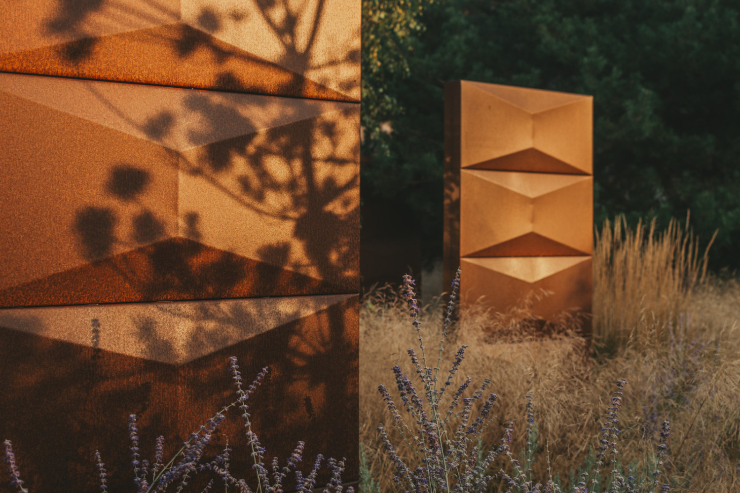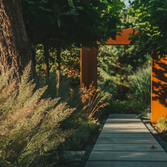 Wśród wykorzystanych materiałów znajdziemy stal pokrytą rdzawą patyną (korten), z której zbudowano dużą bramę, palenisko, drewutnię oraz totemy. Na ścieżkach położono granitowe płyty, a do budowy tarasów użyto egzotyczne drewno.