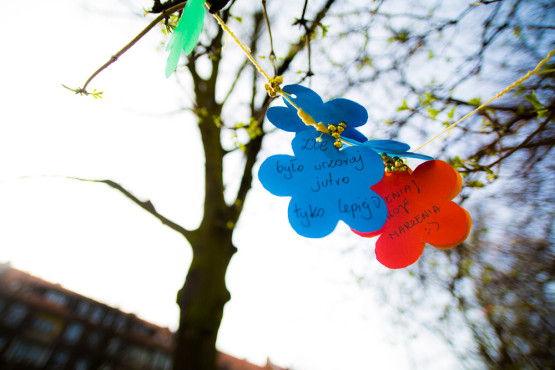 Kilkadziesiąt motyli i kwiatków ozdobiło drzewo rosnące przed Zakręconą Kawiarenką przy al. Jana Pawła II. Na kolorowych karteczkach znajdują się życzenia i miłe słowa od klientów kawiarni. Mają sprawić, by szczecinianie więcej się uśmiechali.