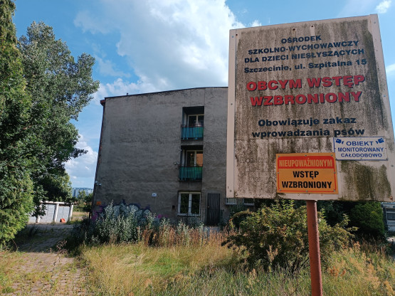 Kompleks sześciu budynków (łącznie 13 760 m2) sąsiaduje ze szpitalem na Pomorzanach przez ulicę. W przeszłości funkcjonowała tam placówka edukacyjna dla dzieci niesłyszących. Formalnie zlikwidowano ją z końcem sierpnia 2021 r., a młodzież przeniosła się do Specjalnego Ośrodka Szkolno–Wychowawczego dla Dzieci Słabosłyszących przy ul. Grzymińskiej 6.