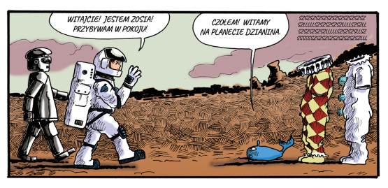 Bohaterką była młoda kosmonautka, która wyruszyła poznawać nowe planety. Na jednej z nich wszyscy poruszają się biegiem. Biegacze codziennie próbują poprawić ostatnią życiówkę. Na co „wydaje mi się, że wyniki to nie wszystko” – mówi do Zosi Robot. Wojciech Ciesielski: – Jeśli chcę coś jej przekazać, to najłatwiej mi to wychodzi w języku komiksu.