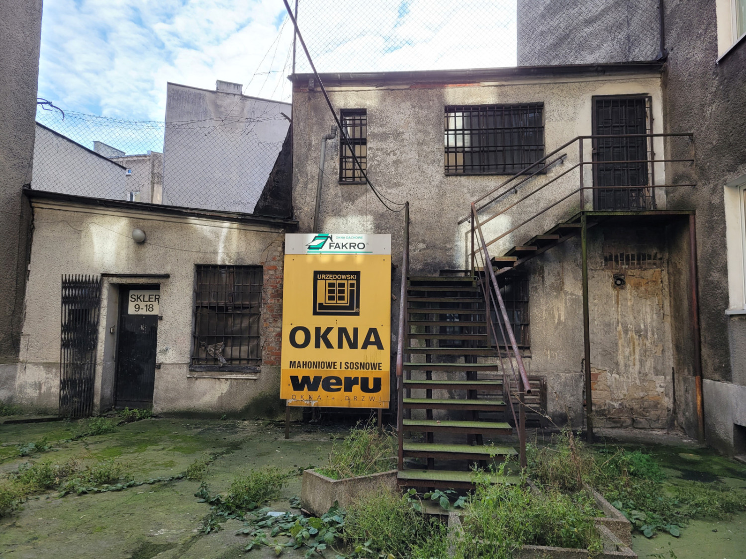 Z sąsiedniej parceli, Piłsudskiego 24A, zniknie parterowy budynek usługowy, zbudowany na planie trapezu i w części nadbudowany. Też jest mocno zniszczony, nie ma do niego dostępu.