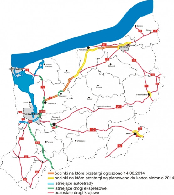 Odcinek drogi ekspresowej S6 pomiędzy Goleniowem, a Koszalinem i Sianowem wraz z obwodnicą tych miast został podzielony łącznie na 7 odcinków realizacyjnych. Inwestycja ta o łącznej długości prawie 140 kilometrów znalazła się w przyjętej 5 sierpnia tego roku przez Radę Ministrów nowelizacji załącznika nr 5 do Programu Budowy Dróg Krajowych na lata 2011-2015. Do końca sierpnia planowane jest ogłoszenie przetargów na zaprojektowanie i budowę pozostałych 3 odcinków S6, budowę obwodnicy Koszalina i Sianowa, a także na inwestycje będące w znowelizowanym załączniku nr 6 – obwodnicę Wałcza w ciągu S10 oraz obwodnicę Szczecinka w ciągu S11. P Przetargi powinny zostać rozstrzygnięte w pierwszej połowie przyszłego roku, a gotową drogą powinniśmy pojechać w 2018 roku.