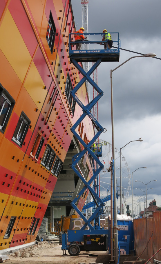 Na razie na budynku montowana jest podkonstrukcja, na której zostanie zainstalowana siatka.