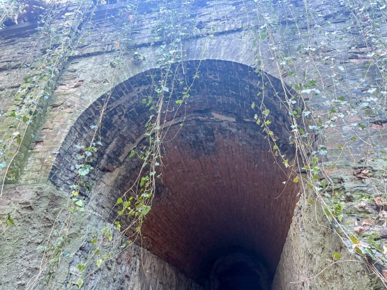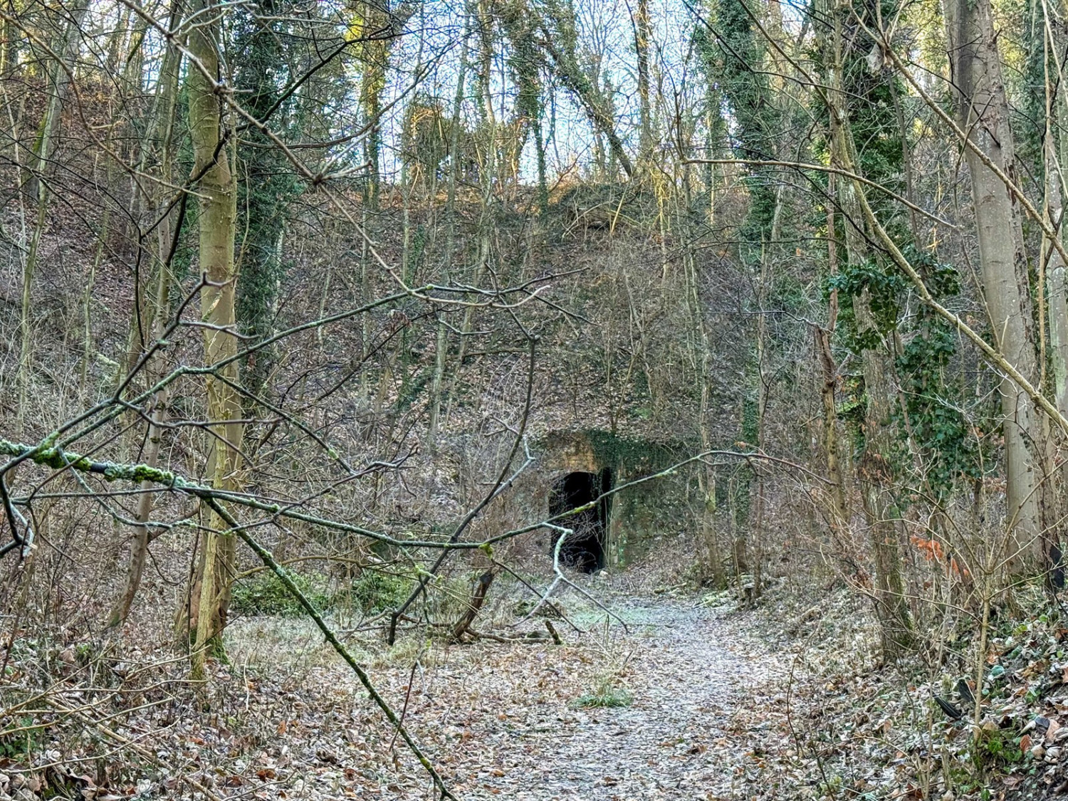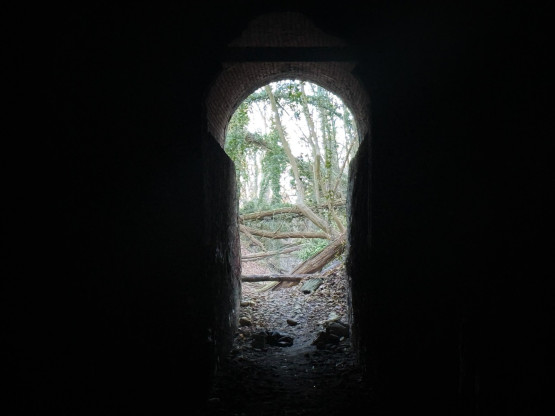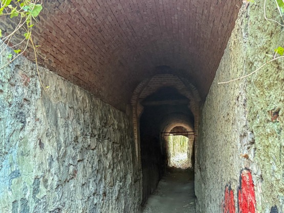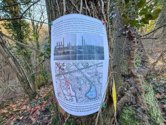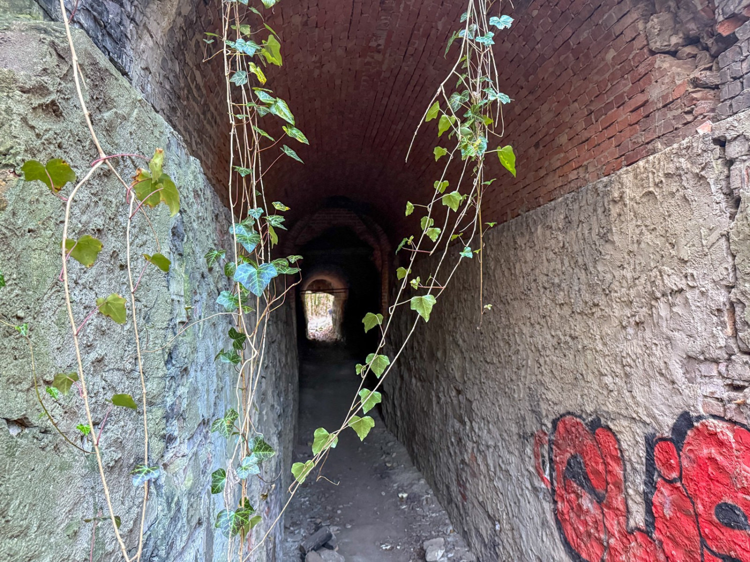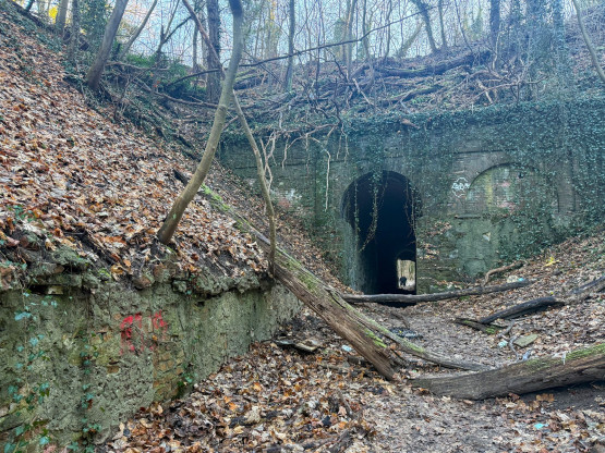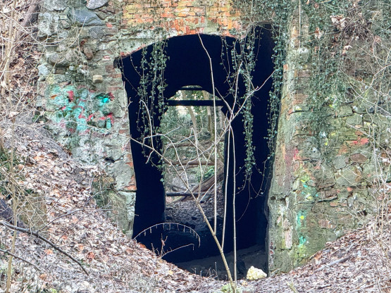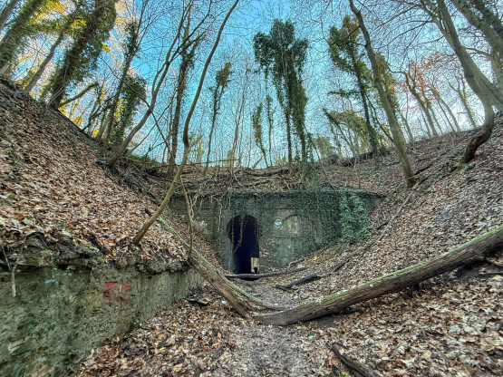 Na początek warto wyjaśnić, że dawniej na tych terenach były dwie kopalnie kredy i margla: kopalnia cementowni w Żelechowej (to ta kopalnia została zalana i w jej miejscu jest dziś Jezioro Szmaragdowe) i druga kopalnia – kopalnia kredy pobliskiej cementowni Stern, czyli kopalnia Friedensburg. To pozostałości tej drugiej kopalni kryją się poza szlakami. Znajduje się tu tunel kolejki wywożącej urobek z kopalni, kanał transportowy kolejki oraz most podtrzymujący kolejkę. Dziś to miejsce dzikie, porośnięte bluszczami i poprzecinane powalonymi drzewami: w takiej scenerii wygląda wręcz bajkowo. Tunelem, charakterystycznym wąwązem i pod mostkiem można przejść.