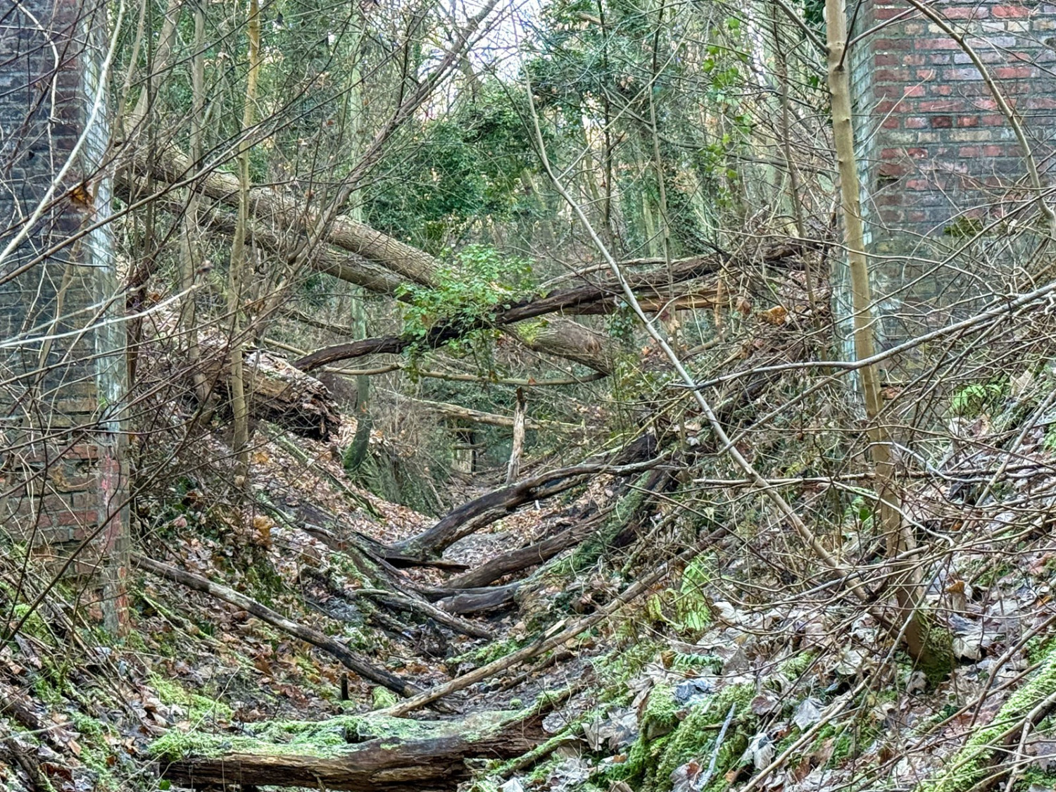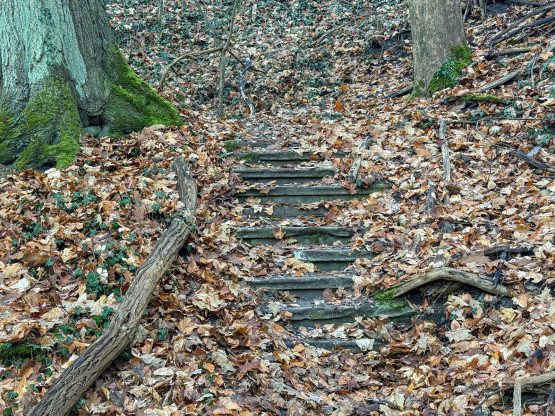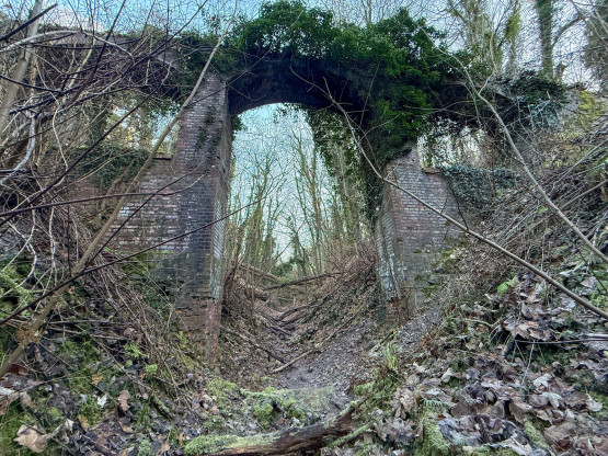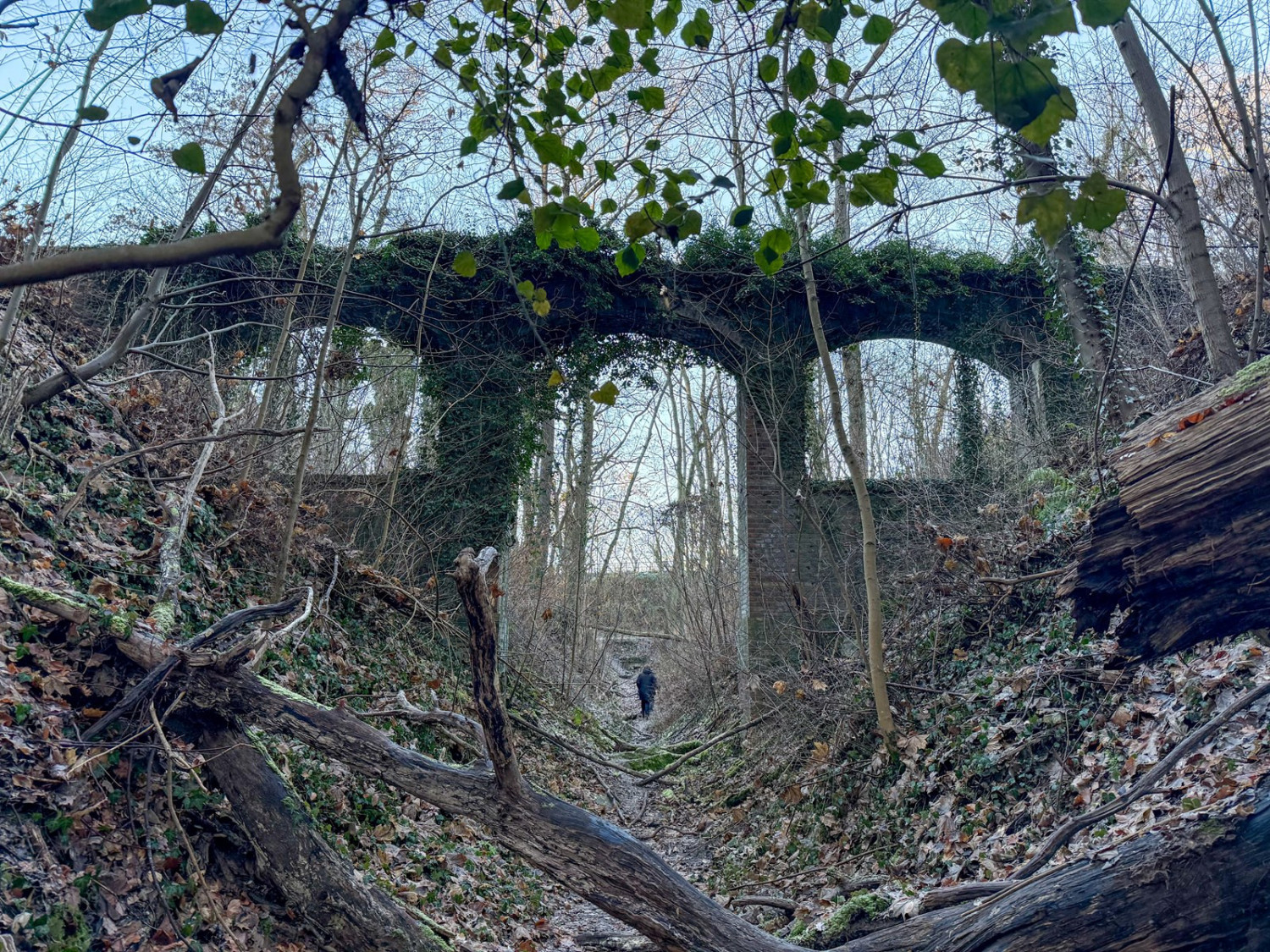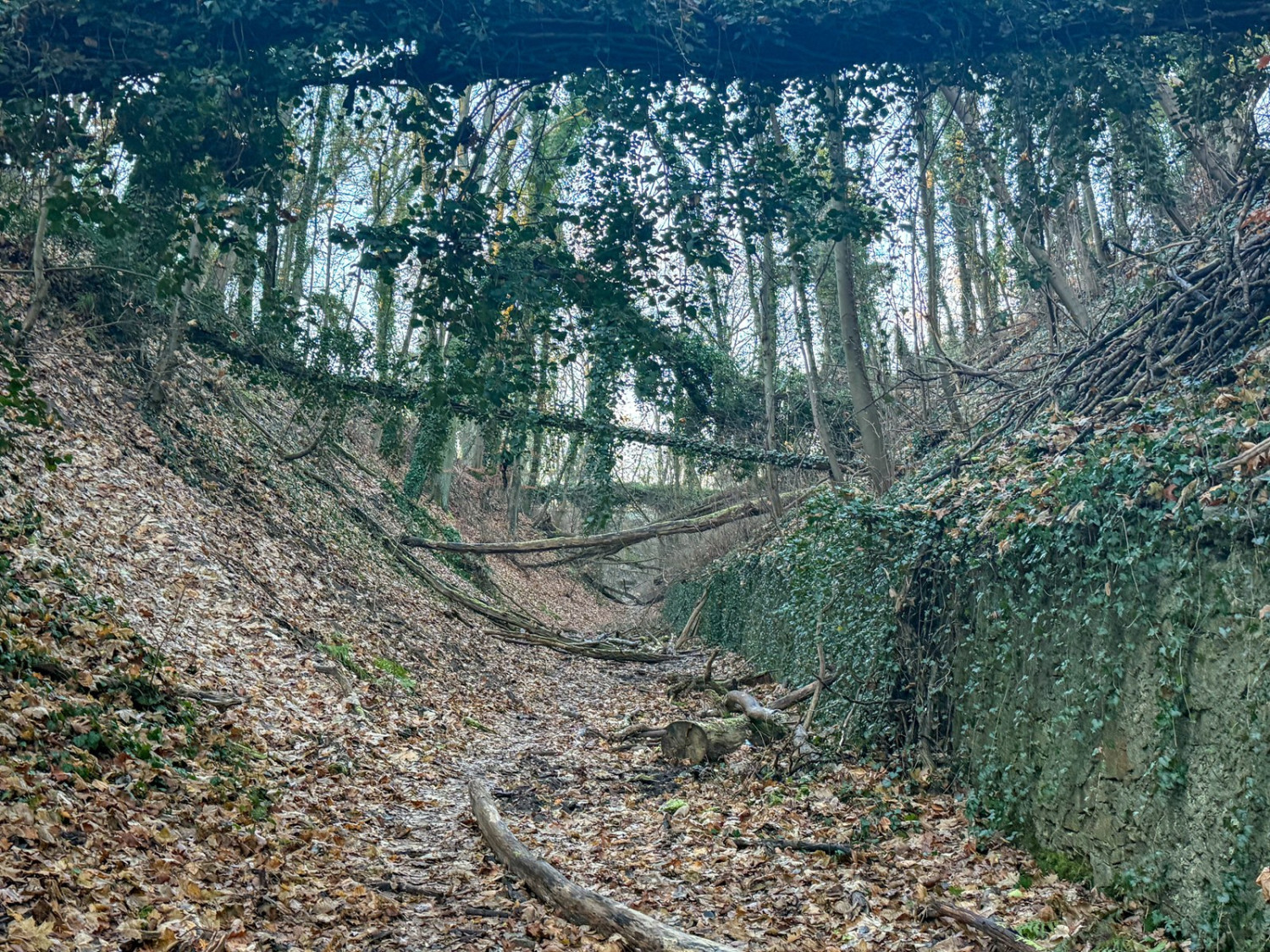 Na początek warto wyjaśnić, że dawniej na tych terenach były dwie kopalnie kredy i margla: kopalnia cementowni w Żelechowej (to ta kopalnia została zalana i w jej miejscu jest dziś Jezioro Szmaragdowe) i druga kopalnia – kopalnia kredy pobliskiej cementowni Stern, czyli kopalnia Friedensburg. To pozostałości tej drugiej kopalni kryją się poza szlakami. Znajduje się tu tunel kolejki wywożącej urobek z kopalni, kanał transportowy kolejki oraz most podtrzymujący kolejkę. Dziś to miejsce dzikie, porośnięte bluszczami i poprzecinane powalonymi drzewami: w takiej scenerii wygląda wręcz bajkowo. Tunelem, charakterystycznym wąwązem i pod mostkiem można przejść.