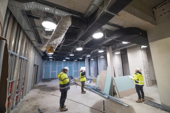 Równolegle prace trwają w budynku edukatorium. Zarówno wewnątrz (m.in. układana są tam płytki ceramiczne i montowane sufity podwieszane), jak i przy elewacji.
