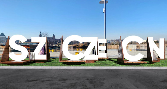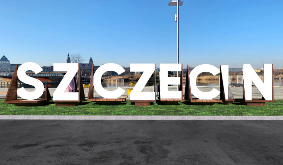 Napis "SZCZECIN" stanie w najpiękniejszej części szczecińskiej Łasztowni, z doskonałym widokiem na panoramę Wałów Chrobrego.