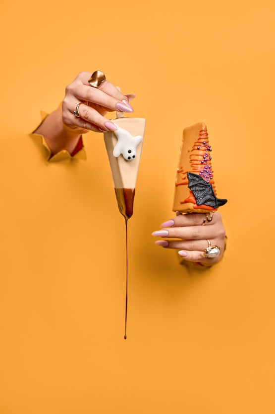 Oferta z upiornymi deserami, limitowana czasowo, dostępna będzie jedynie w dniach 31.10–3.11. W witrynce będą czekać m.in. monoporcje w kształcie dyni (na które składają się korzenne ciasto dyniowe, konfitura z pomarańczy, pralina z pestek dyni i mus kawowy) czy stylizowane na zatrute jabłuszka (w których znajdziemy konfiturę z jabłek, mus toffi, kruchą tartaletkę, żel limonkowy i cynamonową kruszonkę). Będą też serniki na patyku ze strasznymi dekoracjami przypominającymi skrzydła nietoperzy lub duchy czy donuty ozdobione kościstymi rączkami. Nie zabraknie pysznych pączków w trzech limitowanych smakach: pistacja z maliną, orzechowy crème pâtissière ze śliwką i czekolada z pomarańczą. Znajdzie się też coś dla fanów rozpływających się w ustach tortów musowych czy delikatnych ptysiów. I to wszystko w mrocznych, ale i przerażająco pysznych wersjach.