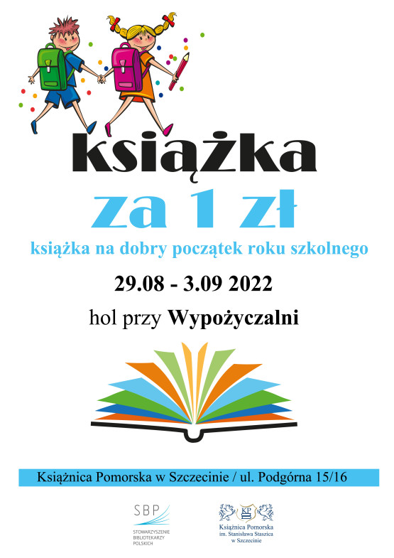Pod hasłem „Książka na dobry początek roku szkolnego” Książnica Pomorska we współpracy z Kołem nr 1 Stowarzyszenia Bibliotekarzy Polskich przygotowała kolejną odsłonę akcji „Książka za 1 zł”. Tym razem na odwiedzających Książnicę czeka sporo książek dla dzieci i młodzieży a także lektury, słowniki czy leksykony.