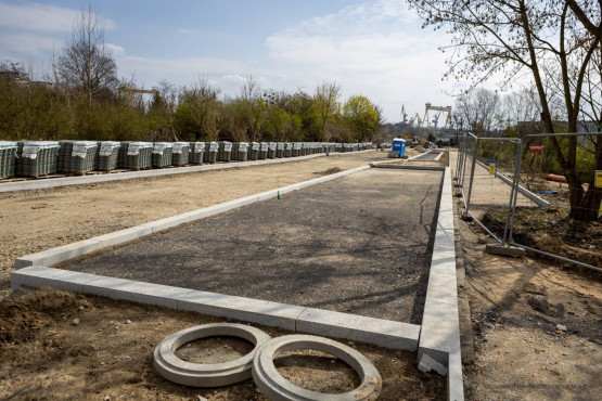 Prace prowadzone wzdłuż szczecińskiego aquaparku obejmują przebudowę utwardzonego wcześniej płytami fragmentu ul. Bożeny (od strony ul. 1 Maja) oraz odcinka, który do niedawna był ścieżką przechodzącą w szerszą drogę szutrową (od strony ul. Sczanieckiej).