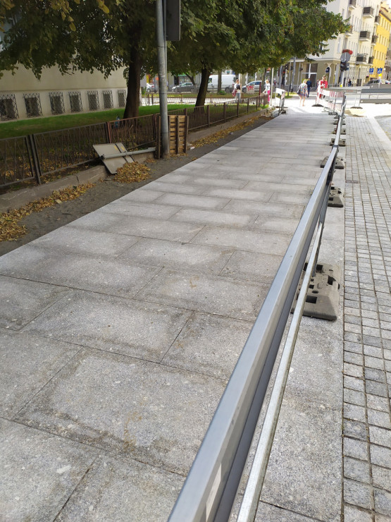 Przebudowywany jest fragment ul. Bolesława Śmiałego od ul. Krzywoustego do ul. Jagiellońskiej. W niektórych miejscach gotowe są już chodniki, które wykonano z ciętych szarych płyt granitowych. Co jeszcze dzieje się na placu budowy?
