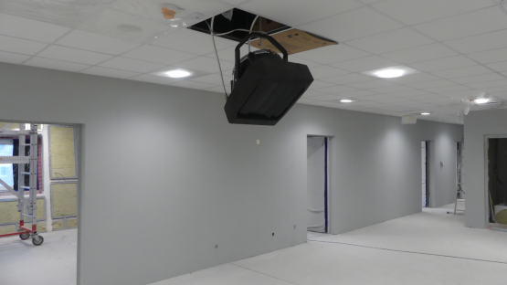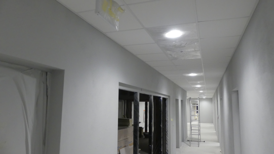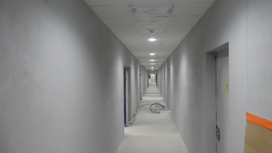 Obecnie wewnątrz Morskiego Centrum Nauki trwają prace przy montażu ocieplenia ścian wewnętrznych i podkonstrukcji do paneli akustycznych. Gotowe są już korytarze i pomieszczenia techniczne, gdzie zakończono tynkowanie i malowanie.