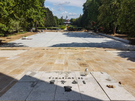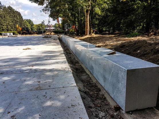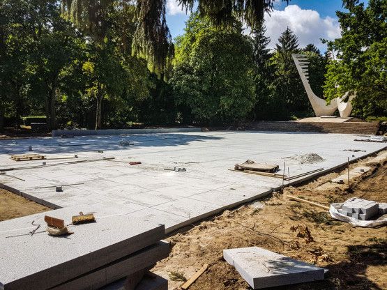 – Niemal na całym placu ułożona jest nowa nawierzchnia. Na bieżąco przywożone są trudno dostępne płyty granitowe wraz z kostką wykonaną z tego samego materiału – mówi Andrzej Kus, rzecznik prasowy miasta ds. gospodarki komunalnej i ochrony środowiska. – Układane są jednocześnie potężne obrzeża okalające przebudowywane miejsce. W miejscu wyburzonych schodów zrobiona została podbudowa, układane są nowe stopnie – wylicza.