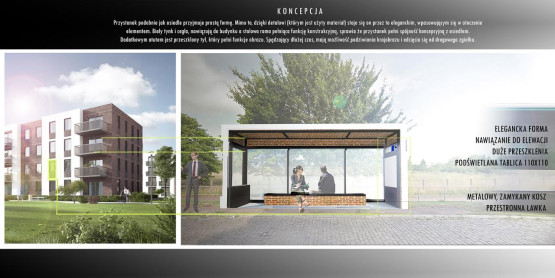 Zwycięski projekt zakłada, że przy budowie wiat powinny zostać użyte biały tynk i cegła. Funkcję konstrukcyjną pełni stalowa rama, tylna oraz boczne części obiektów są przeszklone. Wewnątrz wiat znalazło się miejsce na przestronne ławki. Wybrany projekt jest estetyczny, schludny, a stylistka wiat nawiązuje do powstających zabudowań kompleksu „Nowa Cukrownia”.