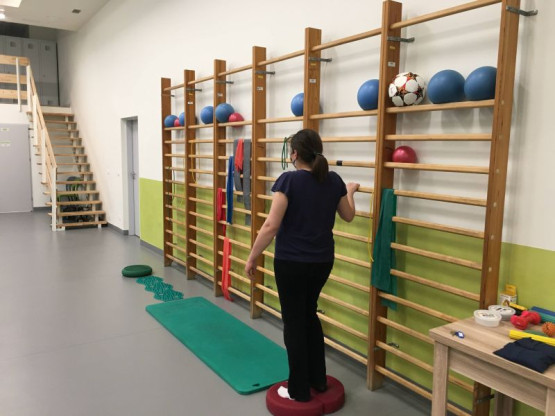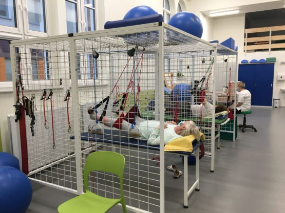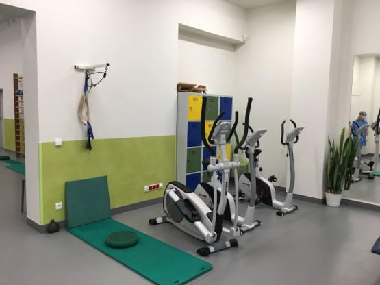 Na parterze wyremontowanej części budynku znalazły miejsce sale kinezyterapii, w tym sala kinezyterapii dla dzieci i zmodernizowane szatnie dla pacjentów. Pierwsze piętro to gabinety lekarskie Poradni Rehabilitacji i Oddziału Dziennego Rehabilitacji Ogólnoustrojowej, fizykoterapia ze stanowiskami do elektrolecznictwa, magnoterapii, laseroterapii i ultradźwięków. Są tu też szatnie dla personelu, pokój socjalny i sala konferencyjna.