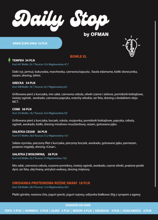 – Rozpisujemy ilość białka, tłuszczy i węglowodanów, tak by osoby planujące swoją dietę wiedziały, jaka jest wartość odżywcza poszczególnych dań i jak można wkomponować posiłek w całość diety. Stawiamy na szybkie, ale pożywne i świeże posiłki. W naszym menu codziennie znajduje się zupa krem oraz owsianka proteinowa z nasionami chia i syropem z agawy. Poza tym mamy bowle XL, takie jak tempeh z dzikim ryżem, edamame i tahini (idealny dla wegan), cobb z kurczakiem, jajkiem, chipsami z boczku i awokado (dla ketogeników) oraz wołowy z naszym autorskim, szarpanym antrykotem wołowym, olejem lnianym, suszonymi pomidorami i serem feta – mówi Andrzej Ofman.