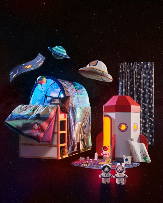 Tekstylia do sypialni z kolekcji AFTONSPARV to prawdziwy raj dla małych miłośników kosmosu. Pościel i poduszki z kosmicznym motywem tworzą nieziemsko przytulną atmosferę w sypialni dziecka. Świecące w ciemności zasłony przypominające galaktykę wnoszą element magii do każdej nocy. Twoje dziecko może teraz patrzeć na gwiazdy przed snem bez wychodzenia z własnego pokoju. Jeśli chcesz zmienić pokój swojego dziecka w jego własny niezwykły wszechświat, dodaj jeszcze dywan. Teraz możecie wspólnie liczyć na nim planety, uczyć się ich nazw i odszukiwać je w Układzie Słonecznym. Planety zostały rozstawione w odpowiednich odległościach od siebie, tak aby było widać ich orbity. Kauczukowy spód utrzymuje dywan na swoim miejscu, a trwałe i plamoodporne włókna, z których został wykonany sprawiają, że jest łatwy w pielęgnacji.