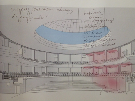 Oprócz tego architekt zaproponował koncepcję, zgodnie z którą fotele na widowni miałby mieć różne kolory, tak by z daleka przypominały piksele. Tę propozycję jednak odrzucono. - Piksele bardziej się nam kojarzą z ekranem i przetwarzanym obrazem niż ze stricte teatralnym wnętrzem. - wyjaśnia wicedyrektorka.