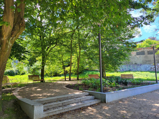 Wyżej, w cieniu drzew, stanęły ławeczki. Na skarpie i centralnym skwerze zasadzono kilkaset krzewów ozdobnych oraz bylin, a także szpaler z grabów.