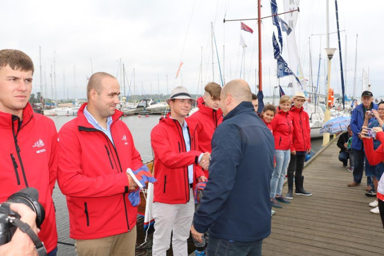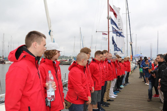 Po krótkim pożegnaniu dyrektor Centrum Żeglarskeigo, Łukasz Pundyk, wręczył kapitanom szczecińskie banderki, a załoganci pożegnali się z rodzinami.
