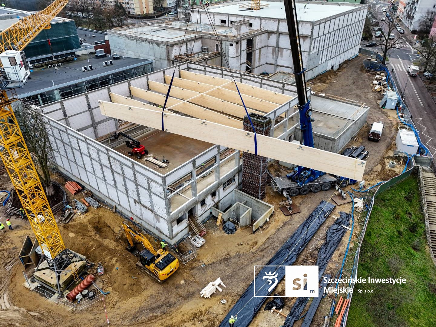 To nie jedyne zmiany, jakie zaszły w ostatnim czasie na placu budowy Szczecińskiego Domu Sportu. Nad halą sportową zamontowano już pokrycie dachu, co oznacza, że wykonawca zbliża się do zamknięcia obiektu.