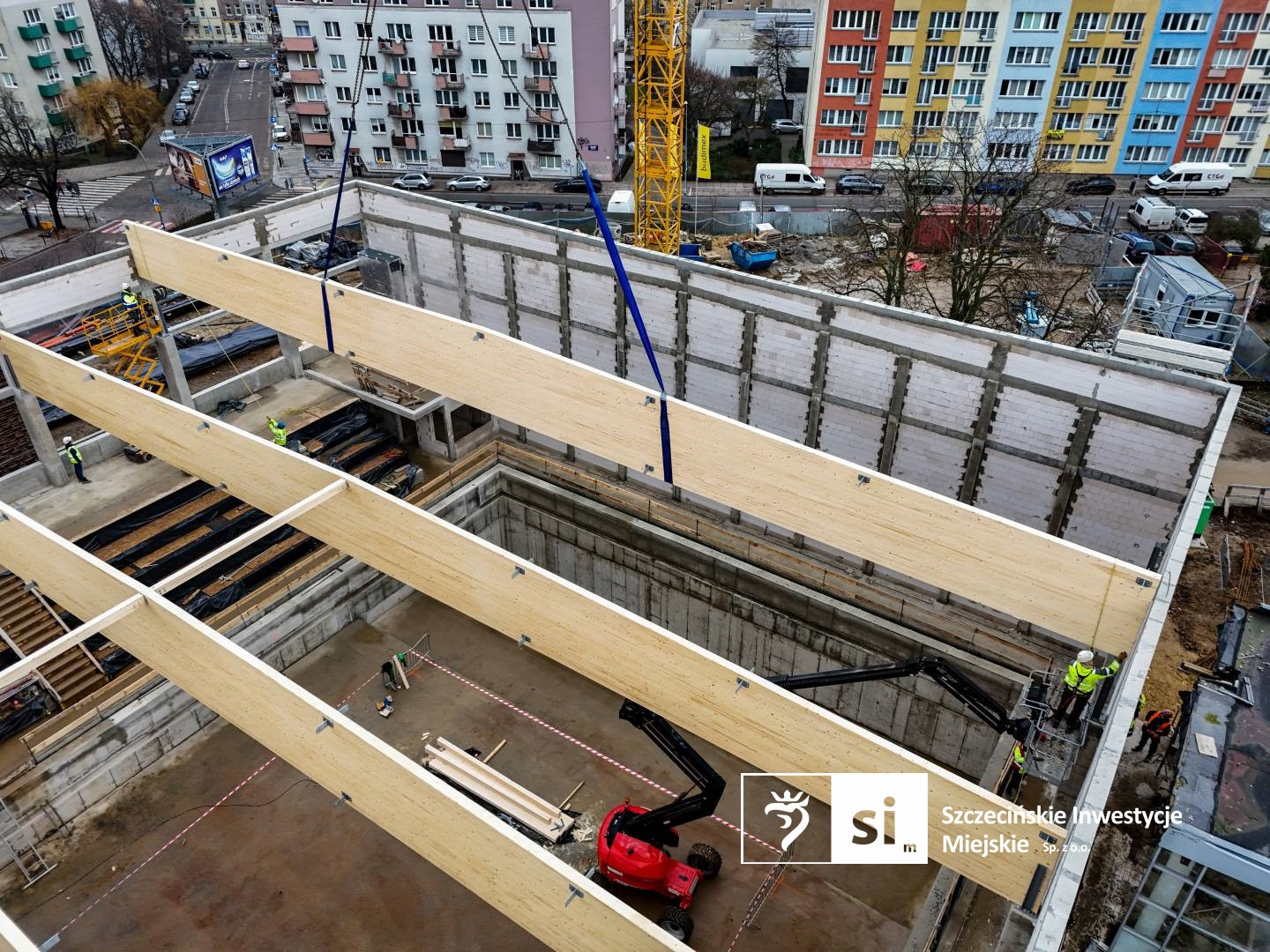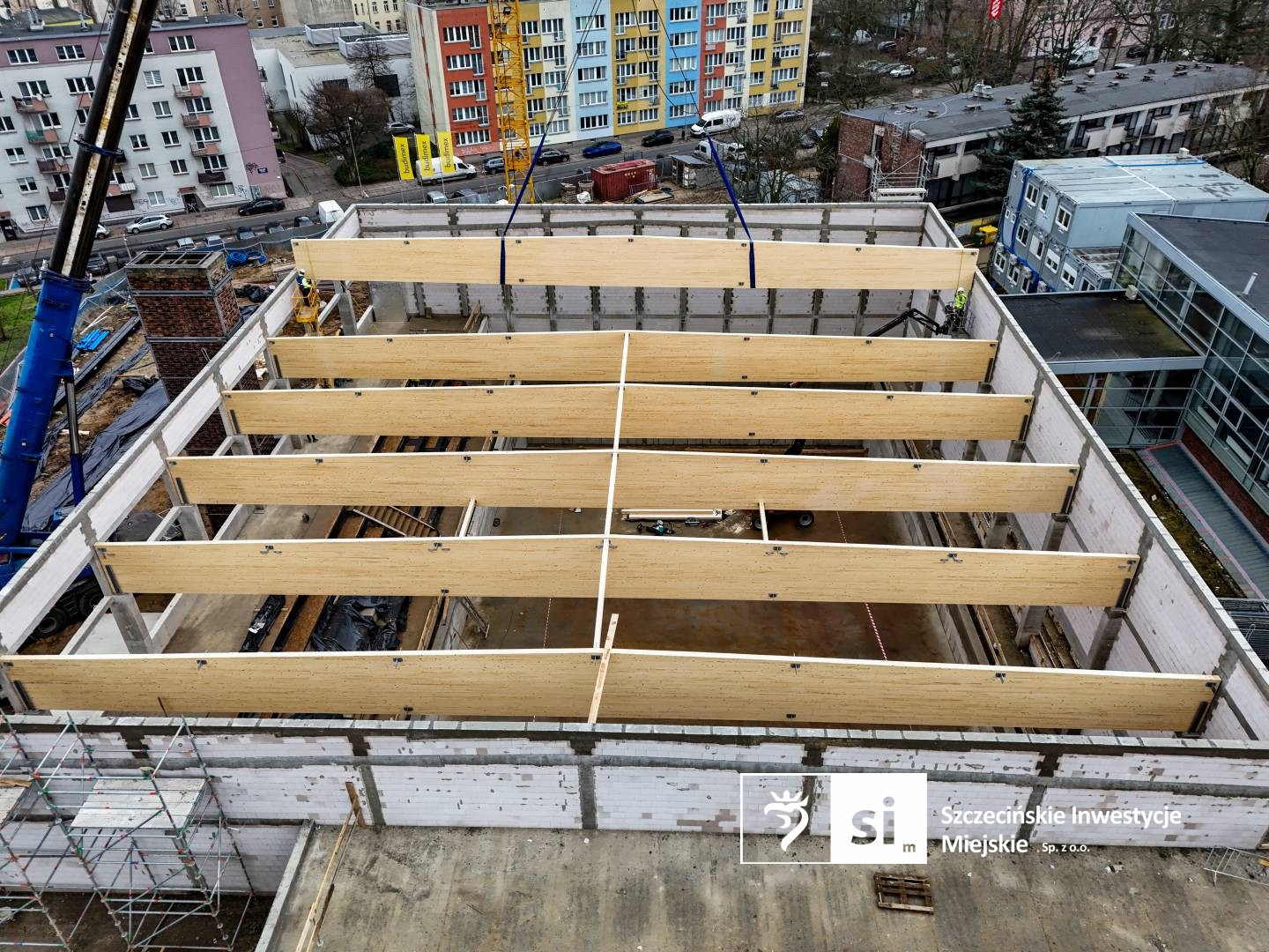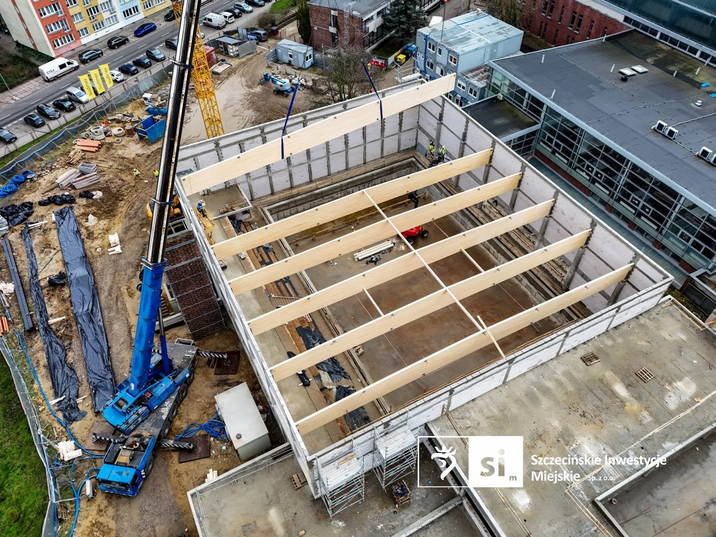 – Długość pojedynczego dźwigara to 31,3 metrów. Całą konstrukcję usztywniają tężniki z drewna klejonego oraz prętowe stężenia połaciowe – informuje Piotr Zieliński, rzecznik prasowy miasta ds. inwestycji.