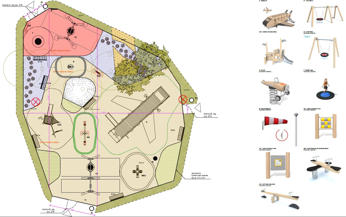 Częścią placu zabaw będzie urządzenie zabawowe w kształcie samolotu. Zaplanowano też domek ze ślizgawką, trampolinę i huśtawki. Wokół pojawi się nowa zieleń.