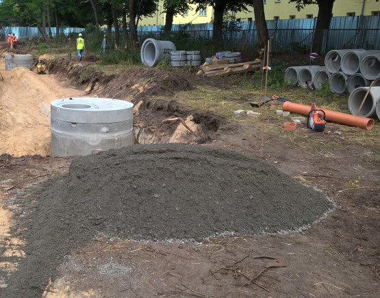 — Zakończyły się prace przygotowawcze i rozbiórkowe, trwają roboty ziemne. Postępują te związane z infrastrukturą podziemna. Nie ma już wiaty, magazynu z blachy oraz budynku składu opału. Częściowo rozebrano plac betonowy oraz ogrodzenie. Wykonawca wybudował częściowo kanalizację deszczową, co będzie kontynuowane w najbliższych tygodniach. Rozpocznie się także wykonanie przyłącza wodociągowego i kanalizacji sanitarnej oraz oświetlenia — relacjonuje Hanna Pieczyńska.