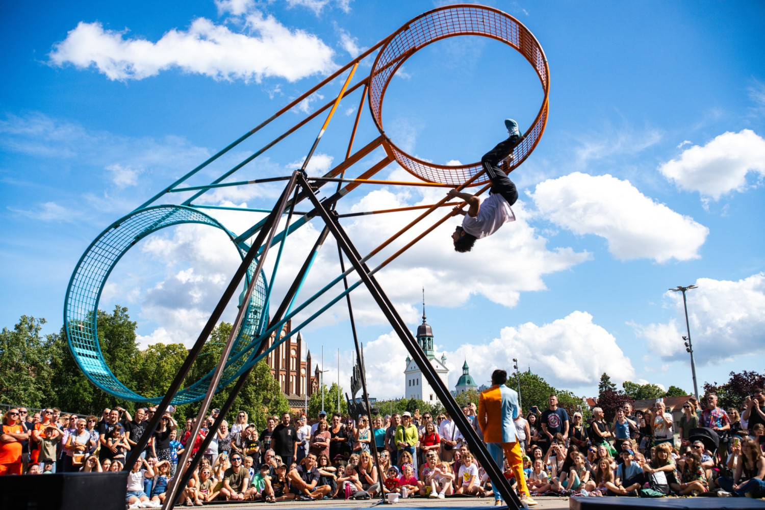 Niedziela także obfitowała w interesujące wydarzenia. Duże zainteresowanie młodszych i starszych widzów wzbudził plenerowy spektakl „Spinsane” przygotowany na placu Solidarności przez Grupę Race Horse z Finlandii. Na ogromnej obrotowej konstrukcji dwoje artystów pokazało show złożone z popisów akrobacji wysokościowej, elementów kabaretu i stand-upu. Mogliśmy zatem zakosztować wielu scen, w których z chaosu i poczucia zagrożenia wykreowany został komizm i zabawa, a artyści ubrani w pomarańczowo-niebieskie kostiumy doskonale dyrygowali nastrojami widzów.
