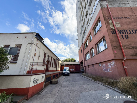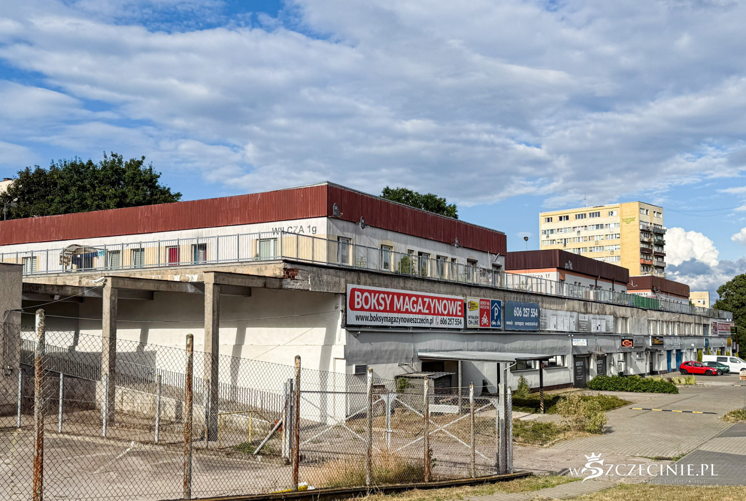 Ostatni obiekt na trasie jest już dużo większy i trochę nowszy – pochodzi z lat 80. To pawilon przy ul. Wilczej. Na dole znajdziemy warsztaty samochodowe i magazyny, a na piętrze… mieszkania socjalne. Zajęły miejsce podupadłej części ze sklepami i lokalami usługowymi.